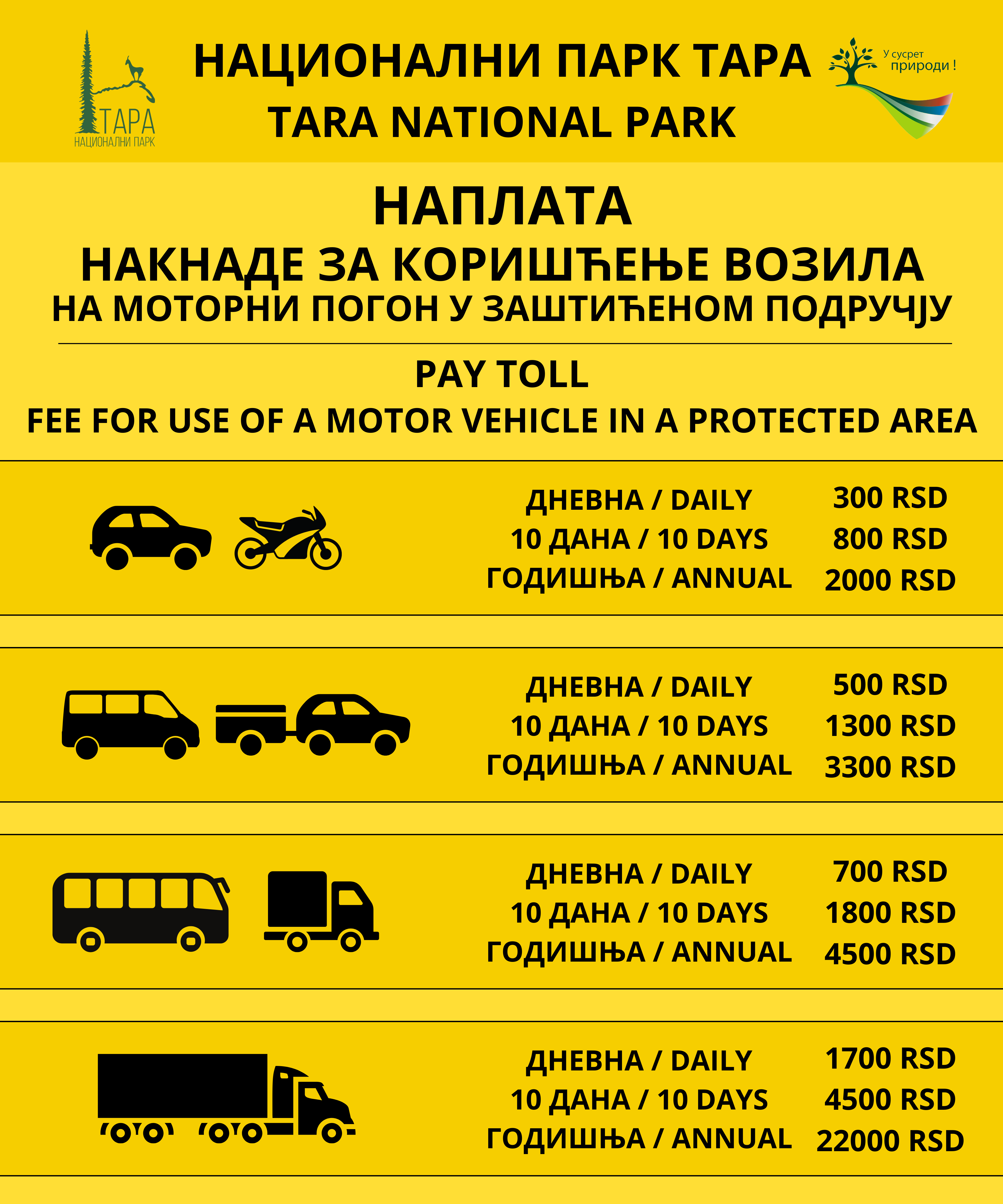 Сви остали посетиоци Националног парка Тара, било којих регистарских oзнака, плаћају накнаду за моторна возила.